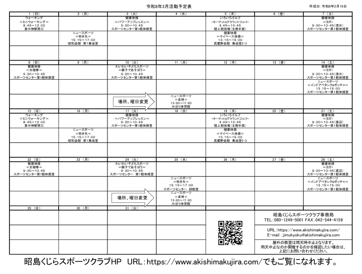 <4の活動予定表 <開催場所は活動予定表の下にあります。> 4月活動予定表 固定ページを表示 活動予定表はこの予定表印刷をクリックすると印刷できます。 <3月の活動予定表 <開催場所は活動予定表の下にあります。> 3月活動予定表 活動予定表はこの予定表印刷をクリックすると印刷できます。 ※各教室の開催場所を以下に示します。 活動拠点2023(r16) 活動拠点はこの活動拠点印刷をクリックすると印刷できます。 Post Views: 7,373 FacebookXBlueskyHatenaCopy